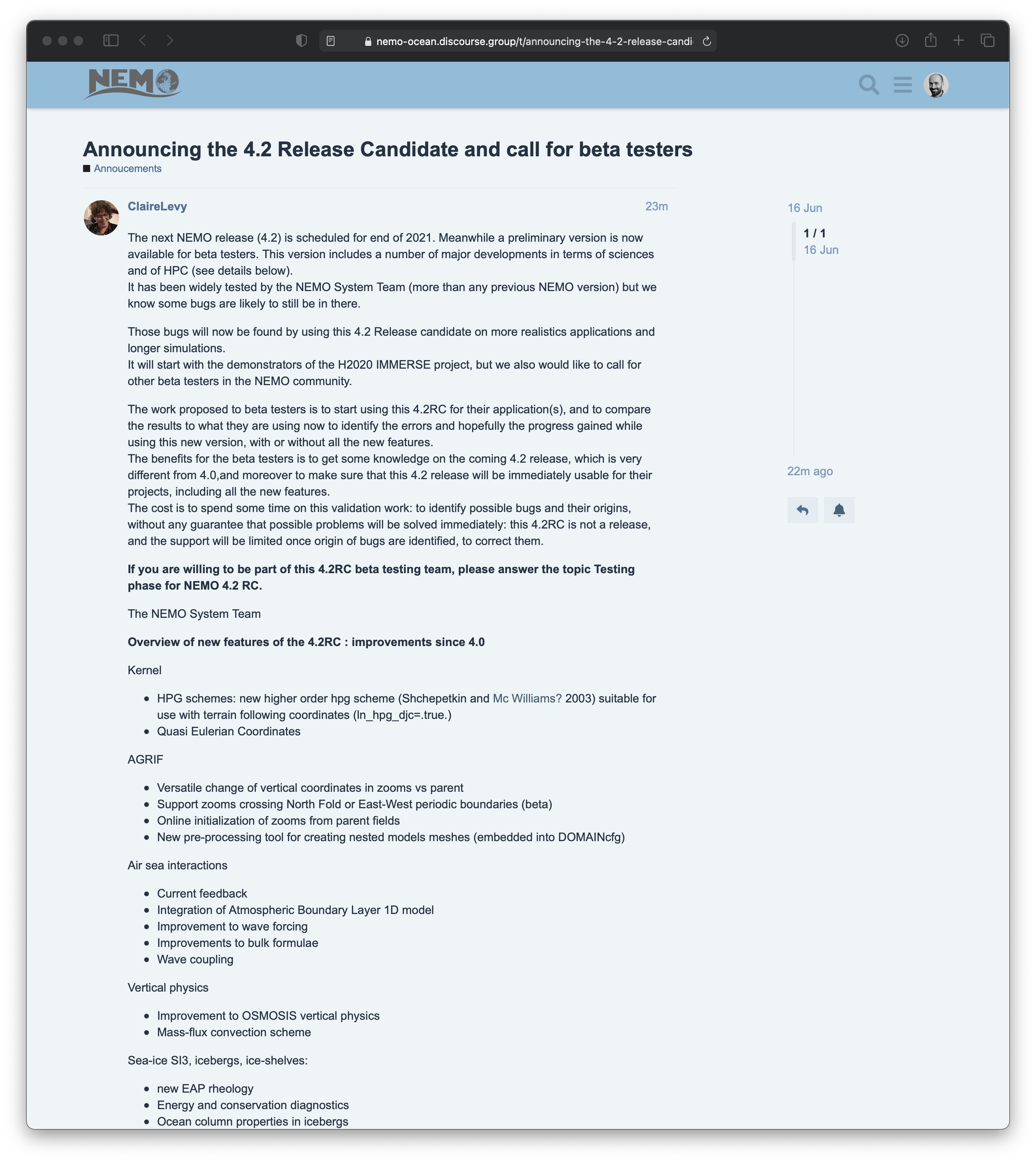 After 30 months of efforts and a global pandemics, the IMMERSE project team and the NEMO system team are glad to officially announce the beta-release of NEMO version 4.2 almost on time ! Congratulations to all the NEMO developpers for this major contribution to the evolution of CMEMS services.